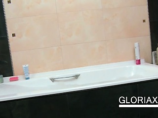 Slim blonde Gloria washing her tight cunt