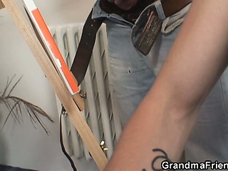 Old bitch swallows two young dicks