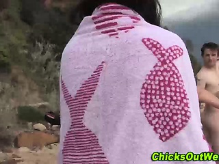 Naked girlfriend at the beach gets naked