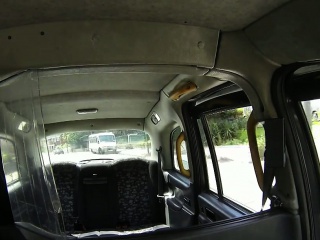 Dark haired babe in black dress banging in fake taxi