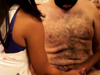 Ebony-skinned dominatrix playing with her sex slave's cock