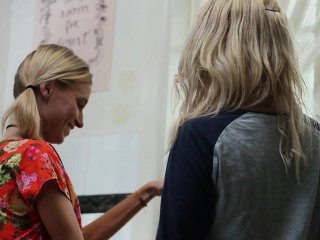 Slim blonde lesbian babes lick each other in the kitchen