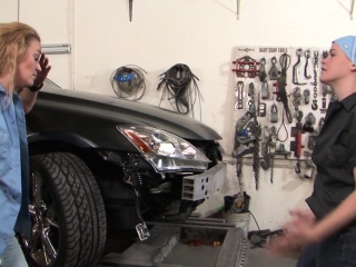 Slutty lesbians having fun in the public garage