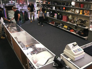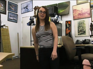 Babe in glasses sells her BFs stuff and screwed by pawn guy