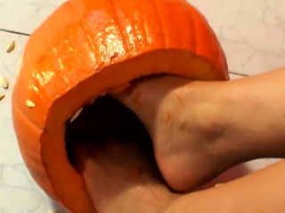Sleek young brunette sucks her pumpkin-covered toes and fingers her snatch