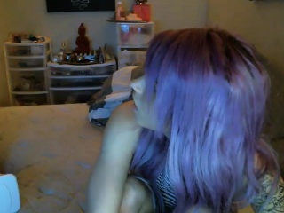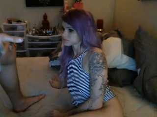 Tattooed guy is jerked off by sexy purple haired girlfriend
