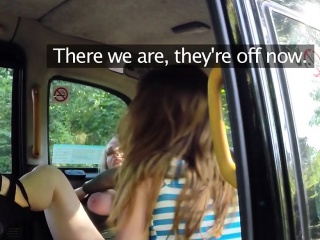 Lesbians trying huge dildo in fake taxi