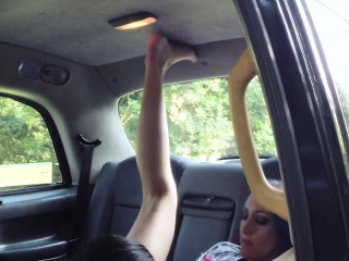 Brunette dyke eats female fake taxi driver