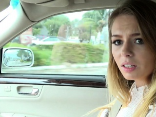 Blonde teen flashing natural tits in car