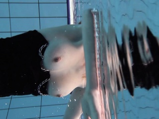 Hot blondie in stockings swims