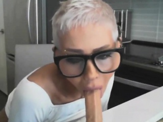 Short haired mature woman fucks her dildo