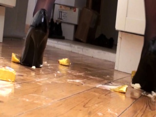Girls crush food with high heels