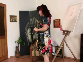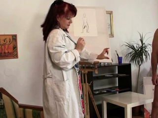 Hot redhead mature paintress sucks and rides young cock