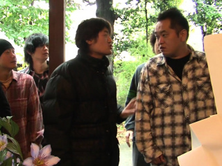 Japanese girl plays with her pussy while some boys peep