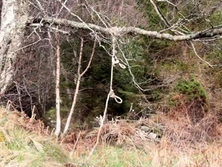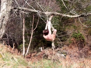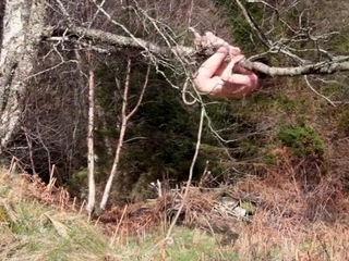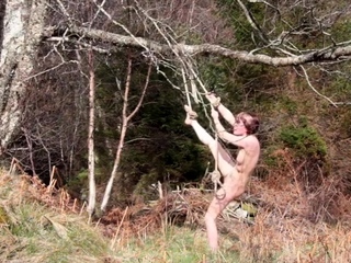 Naked self-bondage in the woods gone wrong.