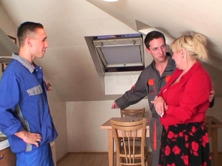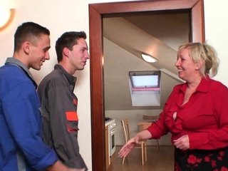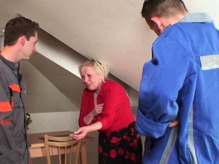 Two repairmen share very old blonde granny