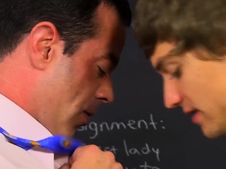 Young man seduced by dashing stud and railed in classroom