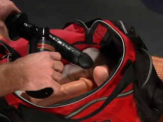 Hunk gets his ass probed by a long dildo