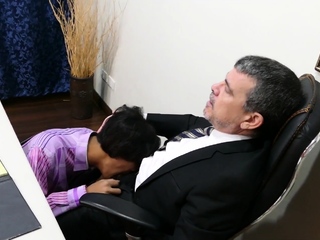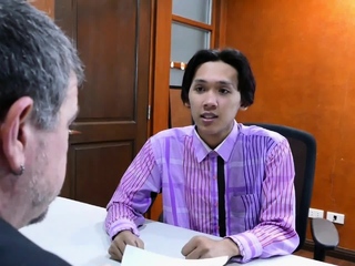 Asian twink barebacked by older male in office