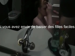 Baisee dans la salle de bain contre le lavabo