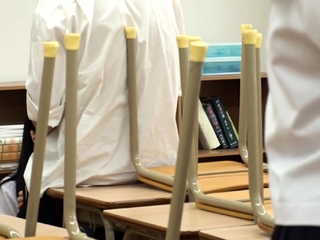Japanese hold the moan blowjob during classroom cleaning