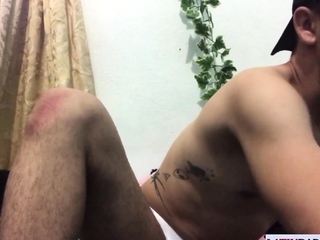 OIled slim Latino masturbates with toy