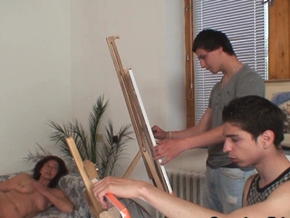 Two young painters share naked old woman