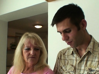 Old blonde mother-in-law rides his huge dick