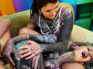 Two tattooed girls get ass fucked by a big dick