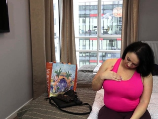 Busty curly brunette with big boobs fucks on couch
