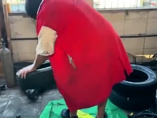 Queen Rayalla and Friends fucks a guy in a workshop