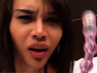 Teen ladyboy with monster cock plays with two dildos in her