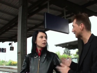 Skinny black-haired woman at street casting