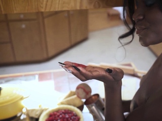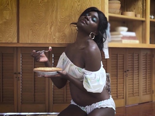 Sexy ebony teen cooking and stripping