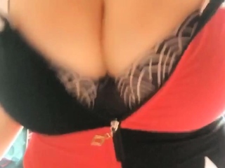 Busty curly brunette with big boobs fucks on couch