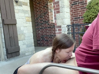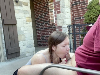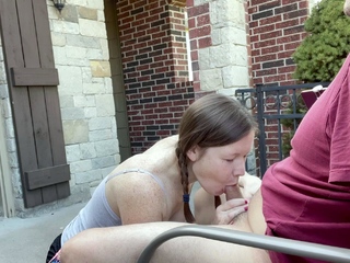 Amazing busty brunette slut doing blowjob outdoor
