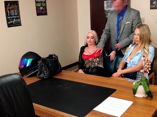 Blonde MILF threeway fuck with babe in the bedroom