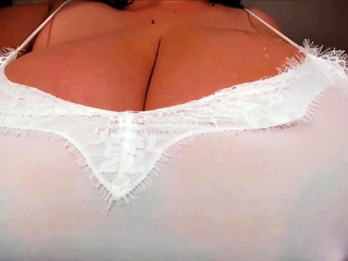 Greek MILF splashes oil on monster boobs in white top